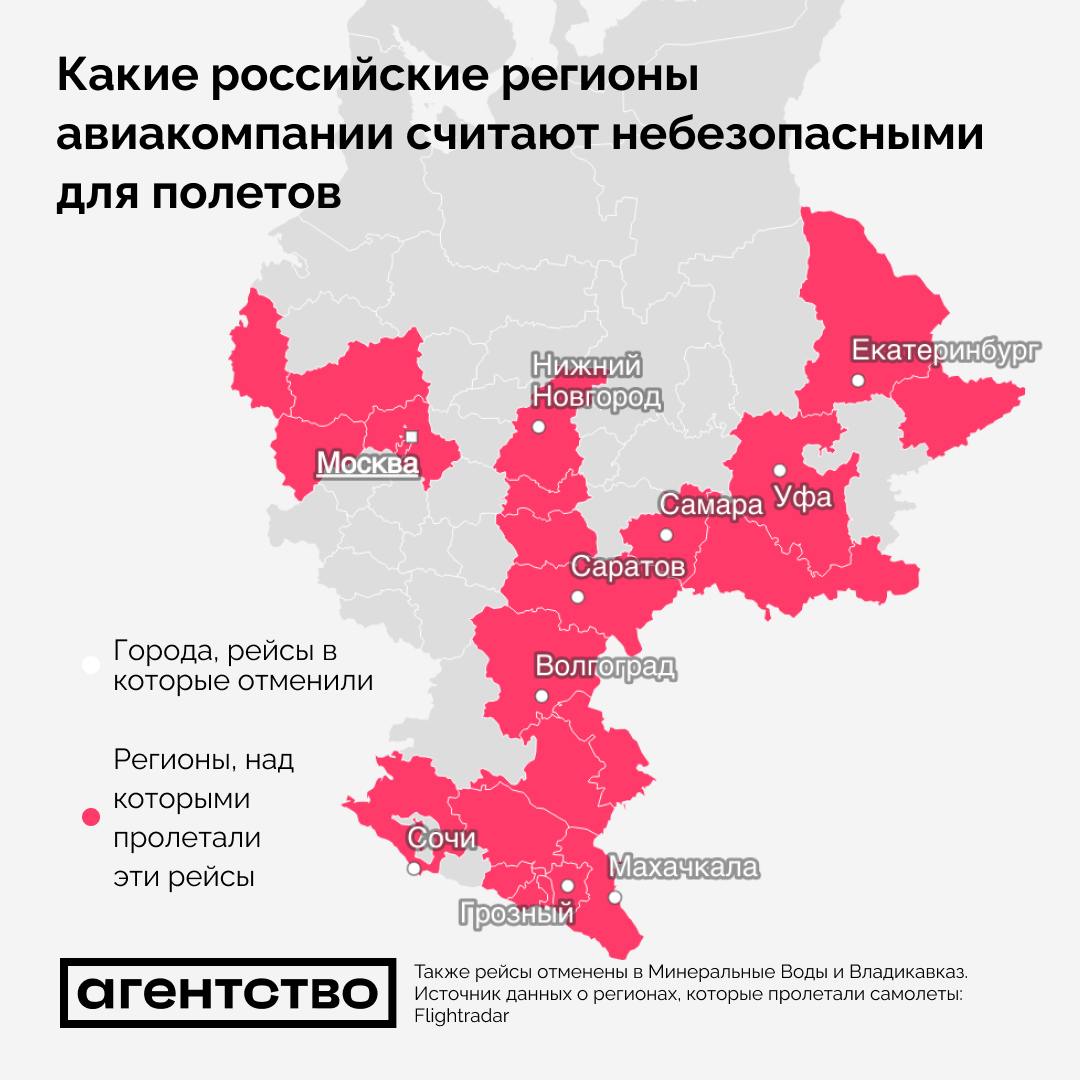 Согласно данным Flightradar, самолеты, которые выполняли отмененные рейсы, пролетали над 24 регионами России: Москвой, Псковской, Тверской, Смоленской, Московской, Курганской, Свердловской, Волгоградской, Саратовской, Оренбургской, Самарской, Нижегородской, Астраханской, Пензенской областями, Дагестаном, Чечней, Ингушетией, Кабардино-Балкарией, Северной Осетией, Калмыкией, Мордовией, Башкортостаном, а также Ставропольским и Краснодарским краем. При этом почти все эти регионы уже подвергались атакам беспилотников.