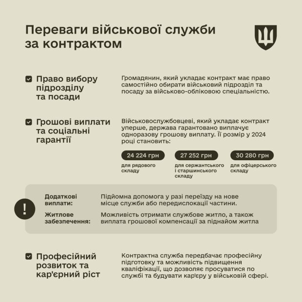 Военная служба в Вооруженных силах Украины по контракту гарантирует стабильный доход, социальную поддержку и право выбора места службы, что является важной альтернативой мобилизации во время военного положения. Министерство обороны