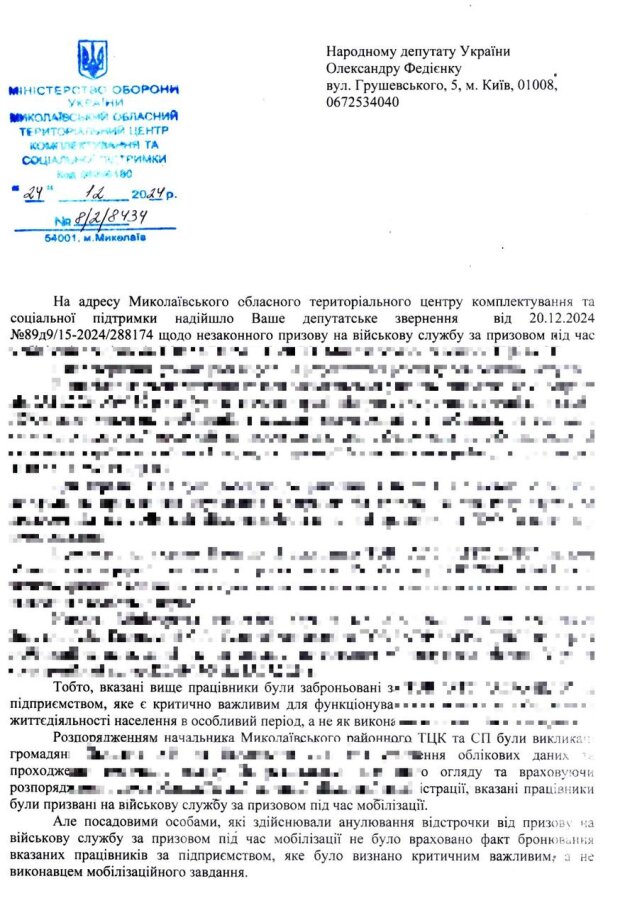 Нардеп Александр Федиенко опубликовал у себя в телеграммах ответ, который он получил от Минобороны относительно мобилизации забронированного работника.