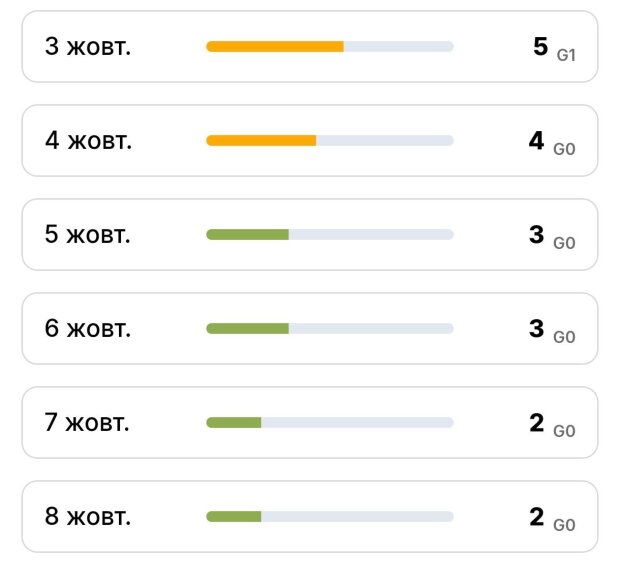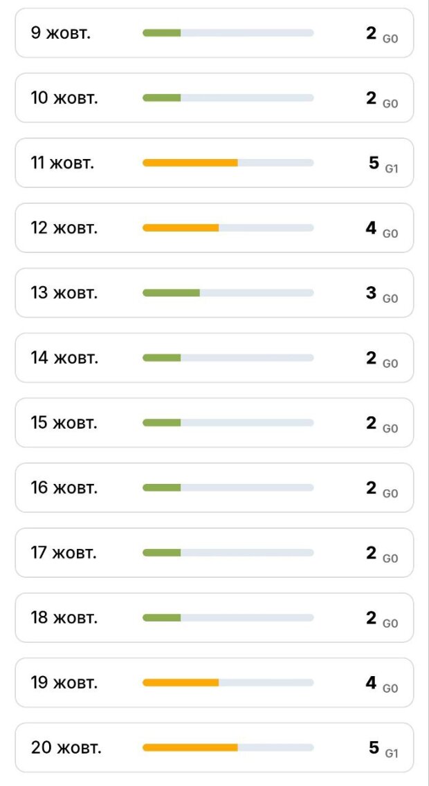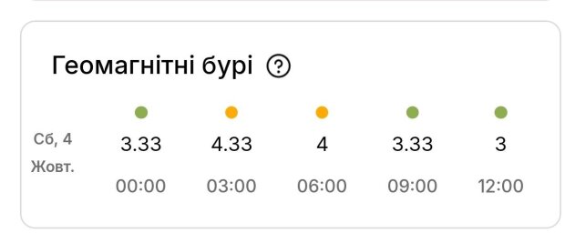 Також є таблиця геомагнітних обурень на декілька днів, але варто зауважити, що потужність магнітних бурь може змінюватись не лише щоденно, а ще й протягом дня, тому варто завжди уважно відстежувати ситуацію в геомагнітній сфері спираючись на дані фахівців з геомагнітної обстановки.