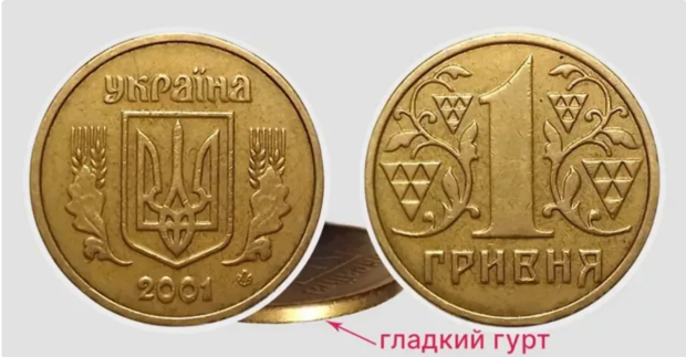 А за 1 грн 2001 року різновиду 1АДг можна виручити до 5 000 грн. Особливість цієї монети в тому, що у неї гладкий гурт без написів.
