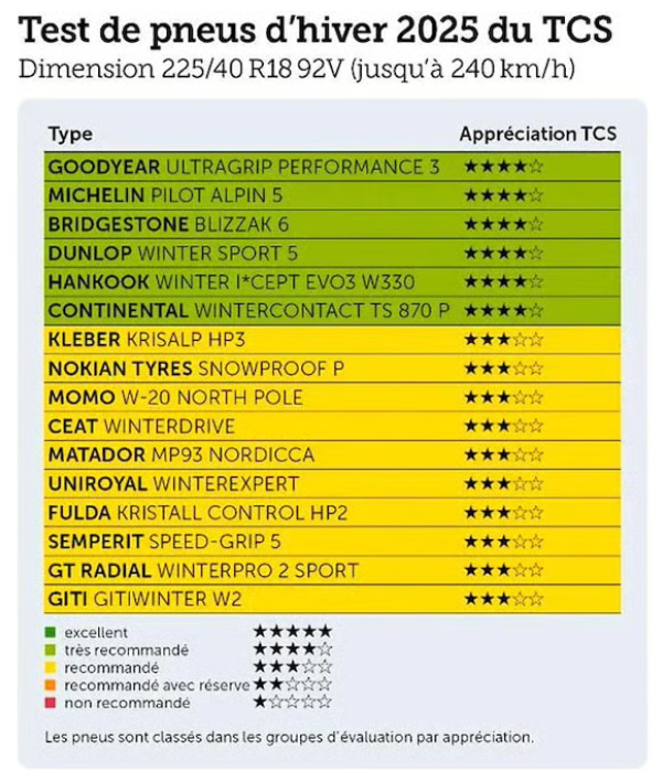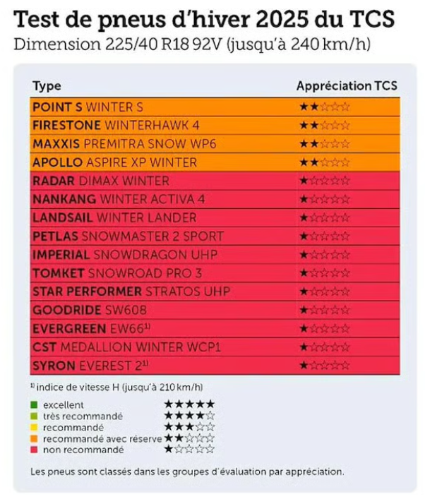 Швейцарська Touring Club Suisse (TCS) провела випробування зимових шин розміром 225/40 R18, та з’ясувала, що дешеві покришки на мокрому асфальті забезпечують гальмівний шлях, в середньому на 15 м довший, ніж лідери рейтингу. Позаяк зими стають теплішими, то до гуми виникли інші вимоги. Усе менше взимку авто їздять глибоким снігом й усе більше — мокрою дорогою. Про це