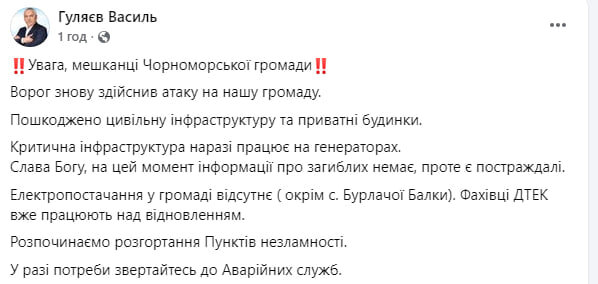 У Чорноморську наразі блекаут після атаки безпілотників, критична інфраструктура зараз працює на генераторах.